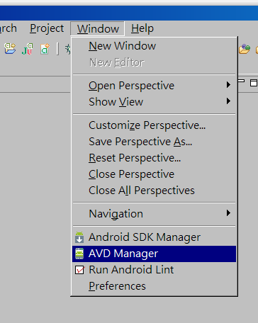 Eclipse 中選擇 Window - AVD Manager