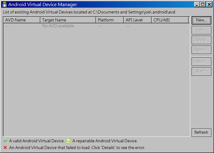 目前沒有任何 AVD、按 New 來產生新的 AVD
