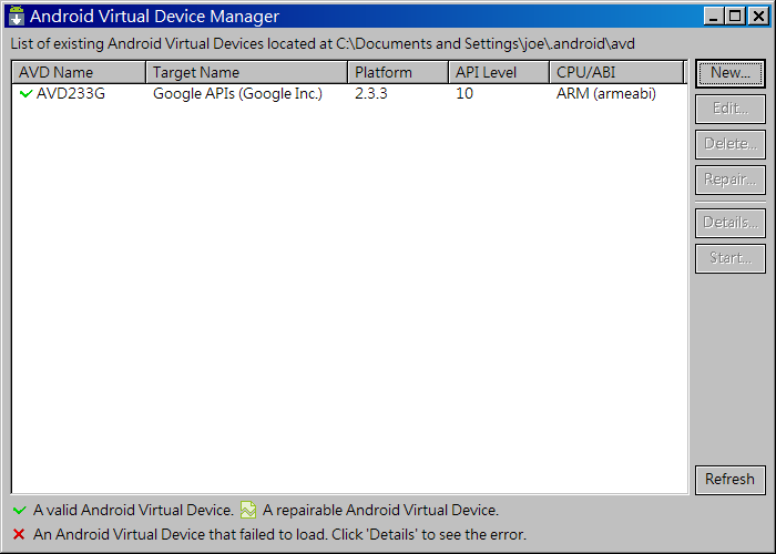 新增一個AVD之後的 畫面,若有需要,可以再增加不同硬體配備與Android版本的AVD