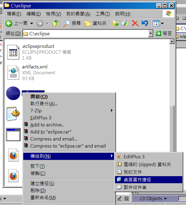 瀏覽到 C:\eclipse 目錄下,將eclipse.exe在桌面設定捷徑