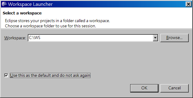 執行 Eclipse,選擇Eclipse的 Workspace(個人建議放在C槽之外,例如D槽), 可以將 Use this as the default and do not ask again打勾