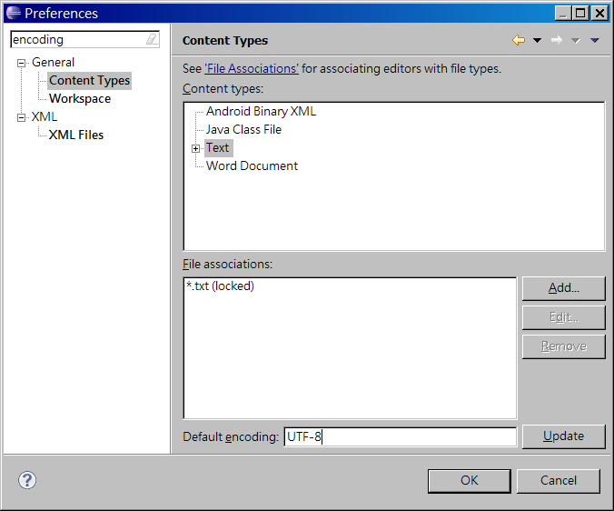 按 Content Types - Text , 在 Default encoding: 中輸入 UTF-8,並按 Update 按鈕