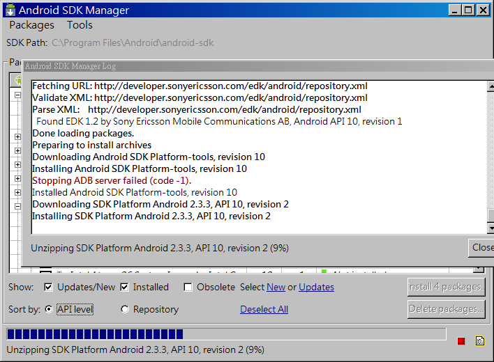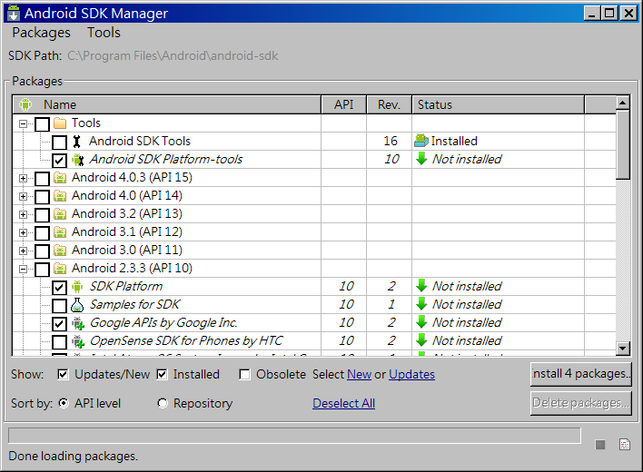 剛開始,只有 Android SDK Tools 已經安裝,其它都尚未安裝(Not installed) ,至少請安裝下列Packages: