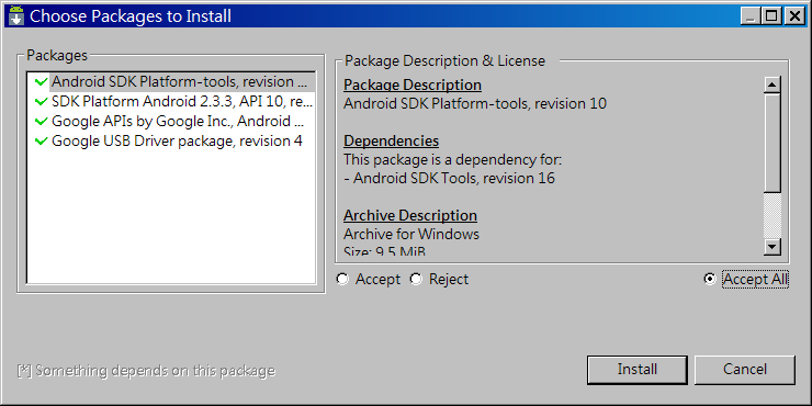 挑選的Packages, 選擇 Accept All後,按Install